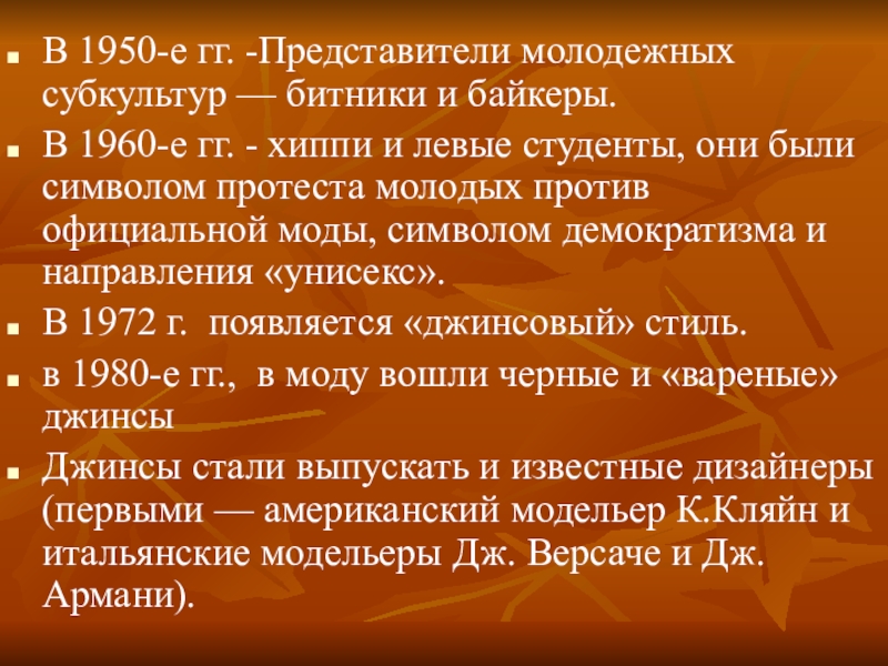 1960-е гг. - хиппи и левые студенты, они были символом протеста молодых против официальной моды, символом демократизма и направления «унисекс».