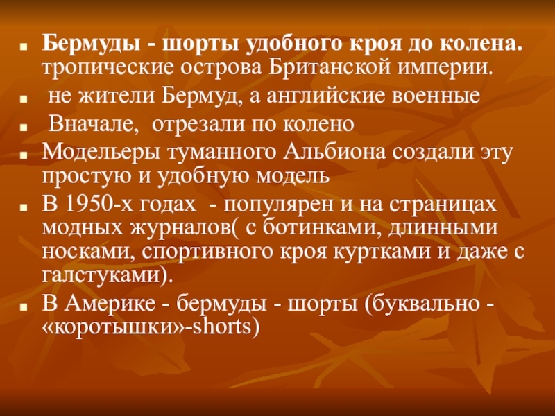 Слайд 27Бермуды - шорты удобного кроя до колена.