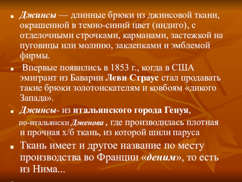 Слайд 24Джинсы — длинные брюки из джинсовой ткани, окрашенной в темно-синий цвет