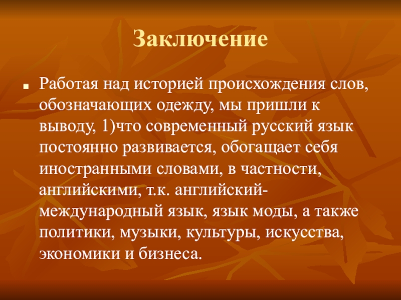 1)что современный русский язык постоянно развивается, обогащает себя иностранными словами, в частности, английскими, т.к. английский- международный язык, язык моды, а также политики, музыки, культуры, искусства, экономики и бизнеса.
