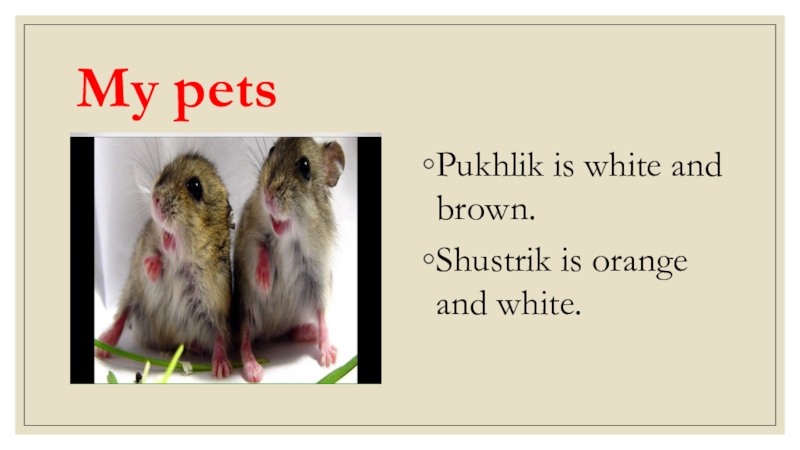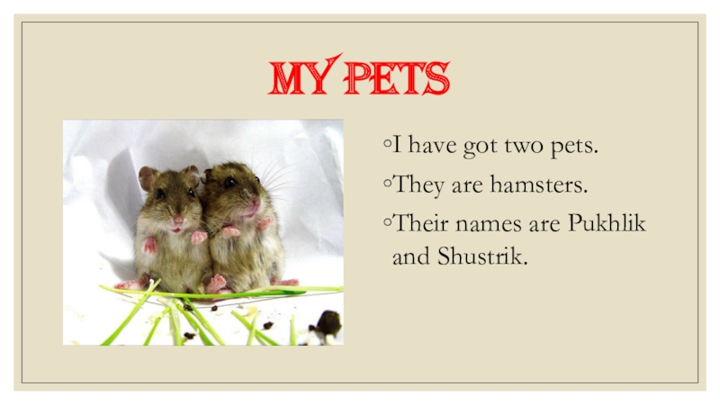 MY PETSI have got two pets.They are hamsters.Their names are Pukhlik and Shustrik.