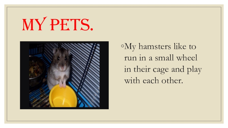 My pets.My hamsters like to run in a small wheel in their cage and play with each