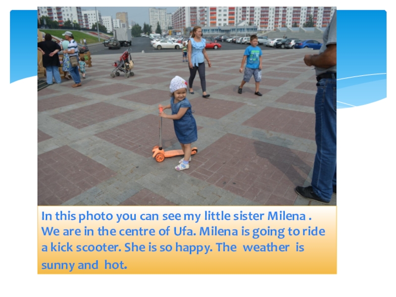 We are in the centre of Ufa. Milena is going to ride a kick scooter. She is so happy. The weather is sunny and hot.