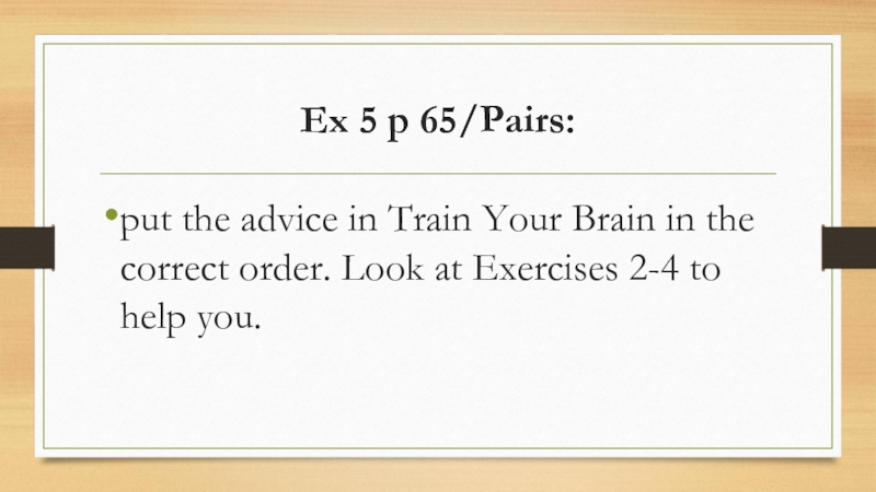Ex 5 p 65/Pairs:put the advice in Train Your Brain in the correct order. Look at Exercises