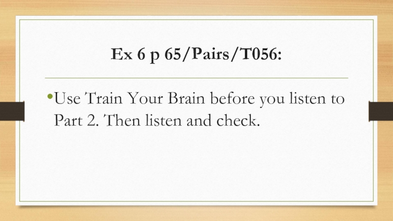 Ex 6 p 65/Pairs/T056:Use Train Your Brain before you listen to Part 2. Then listen and check.