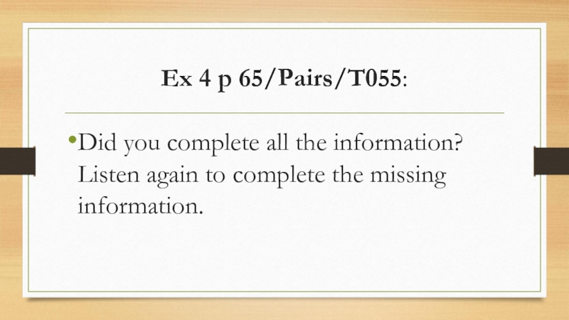 Ex 4 p 65/Pairs/T055:Did you complete all the information? Listen again to complete the missing information.