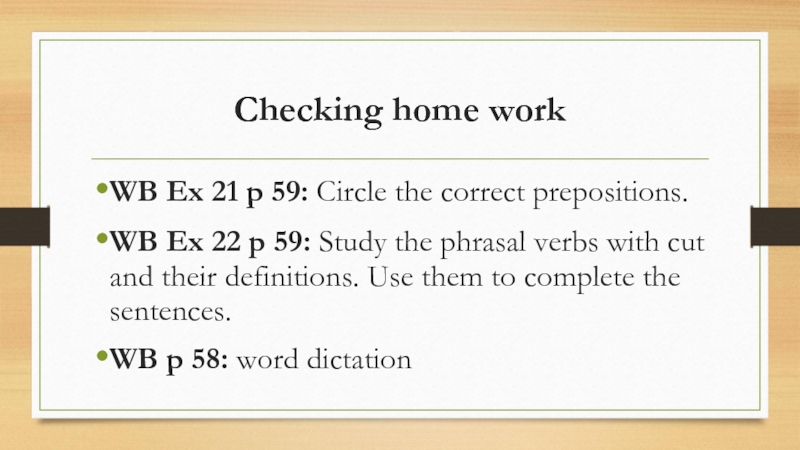 Checking home workWB Ex 21 p 59: Circle the correct prepositions.WB Ex 22 p 59: Study the phrasal verbs with cut and their definitions. Use them to complete the sentences. WB p 58: word dictation