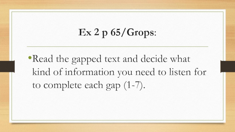 Ex 2 p 65/Grops:Read the gapped text and decide what kind of information you need to listen