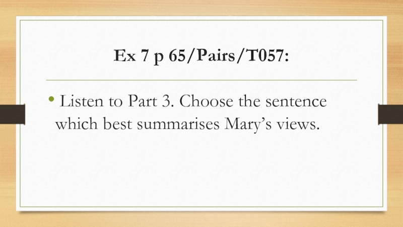 Ex 7 p 65/Pairs/T057: Listen to Part 3. Choose the sentence which best summarises Mary’s views.