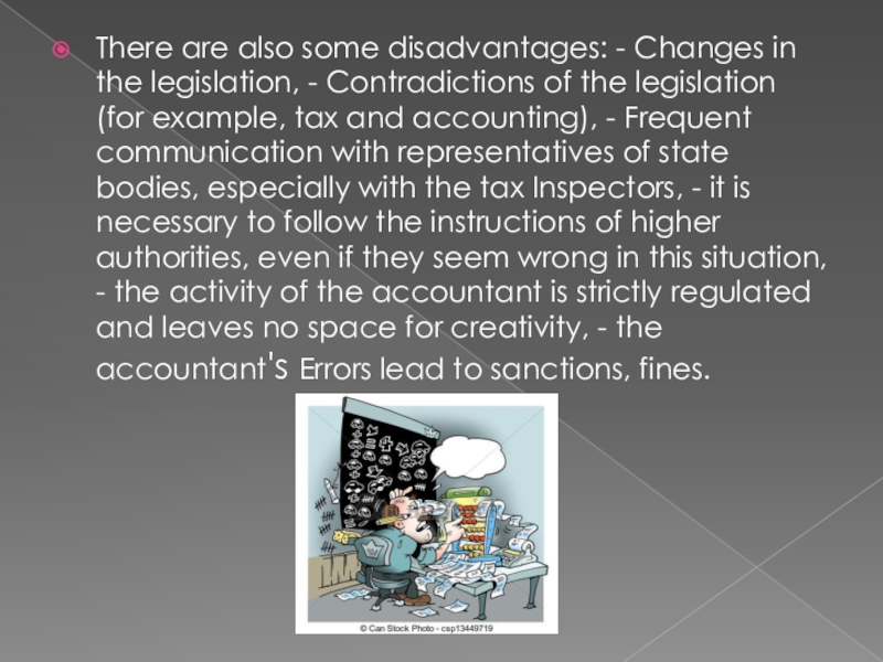Contradictions of the legislation (for example, tax and accounting), - Frequent communication with representatives of state bodies, especially with the tax Inspectors, - it is necessary to follow the instructions of higher authorities, even if they seem wrong in this situation, - the activity of the accountant is strictly regulated and leaves no space for creativity, - the accountant's Errors lead to sanctions, fines.