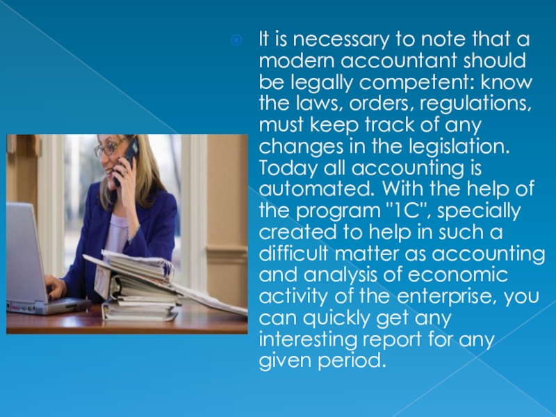 legally competent: know the laws, orders, regulations, must keep track of any changes in the legislation. Today all accounting is automated. With the help of the program "1C", specially created to help in such a difficult matter as accounting and analysis of economic activity of the enterprise, you can quickly get any interesting report for any given period.