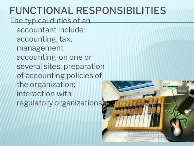 accounting-on one or several sites; preparation of accounting policies of the organization; interaction with regulatory organizations.