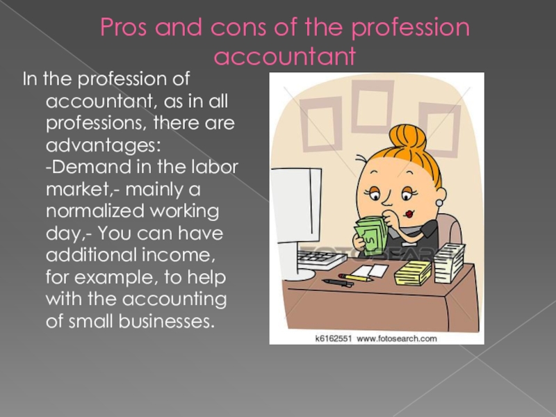 as in all professions, there are advantages: -Demand in the labor market,- mainly a normalized working day,- You can have additional income, for example, to help with the accounting of small businesses.