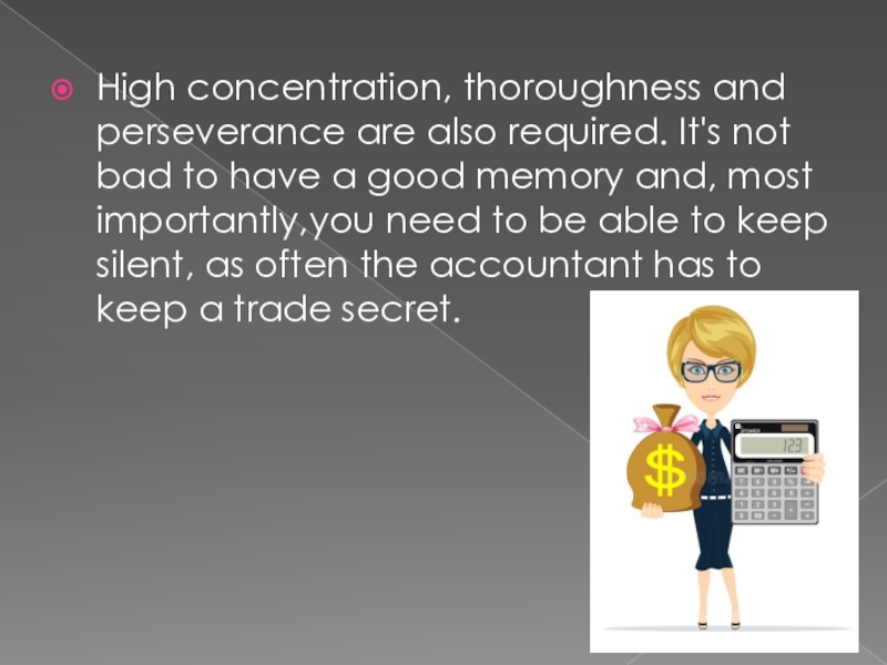 Слайд 8High concentration, thoroughness and perseverance are also required. It's not bad
