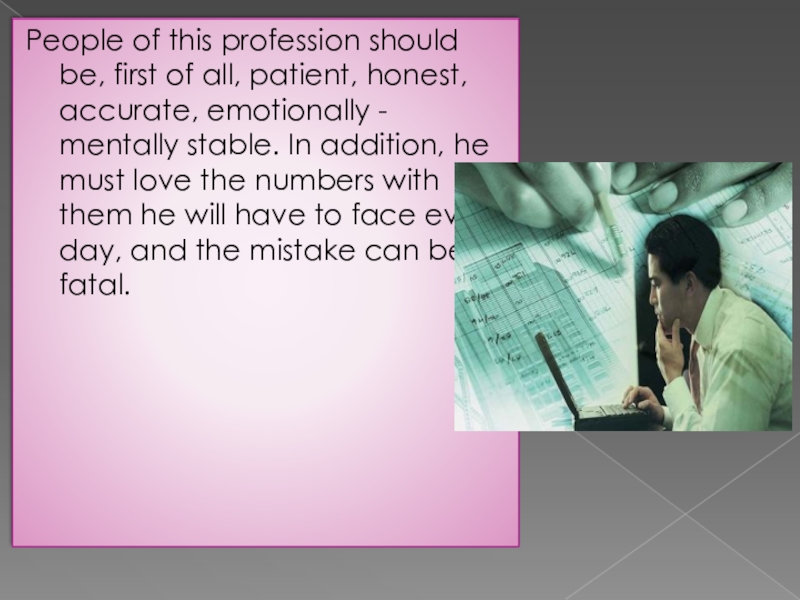 accurate, emotionally - mentally stable. In addition, he must love the numbers with them he will have to face every day, and the mistake can be fatal.
