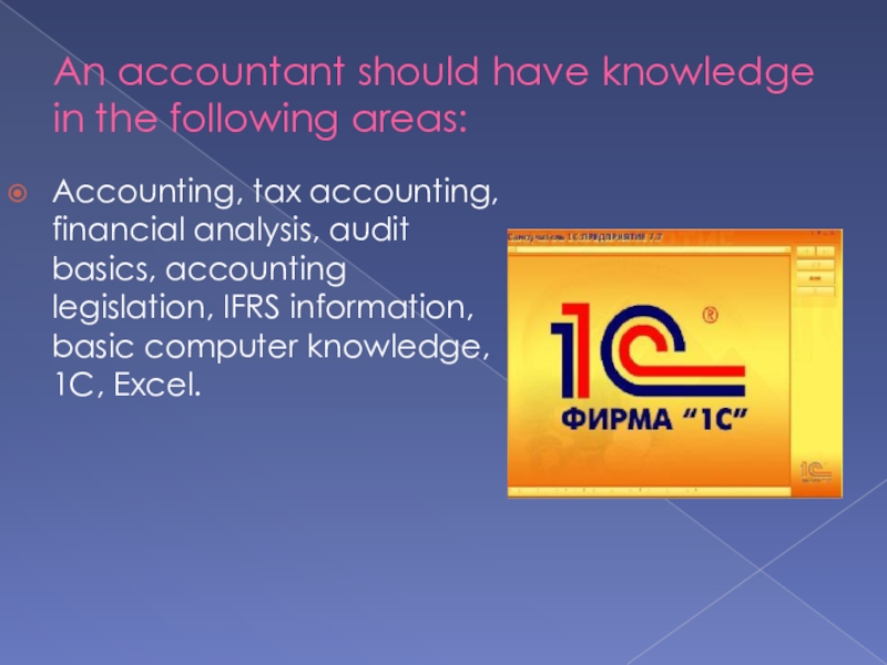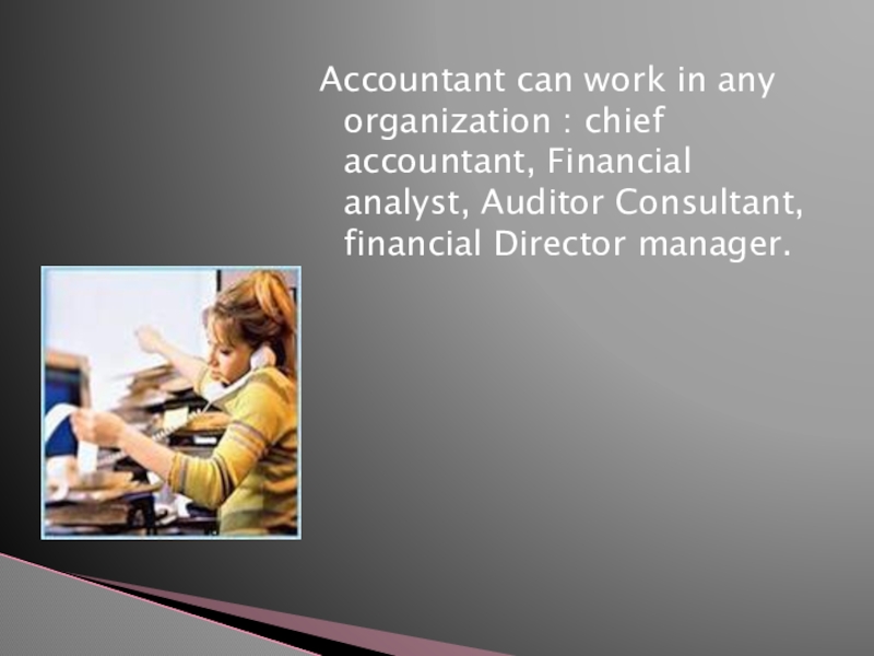 Слайд 12Accountant can work in any organization : chief accountant, Financial analyst,