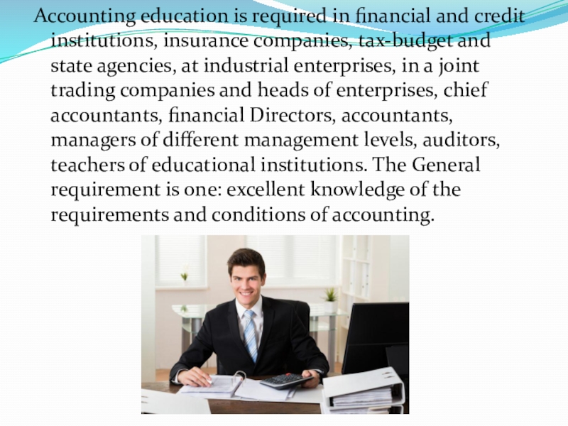 Слайд 14Accounting education is required in financial and credit institutions, insurance companies,