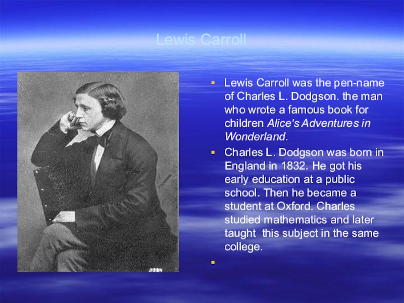 Charles L. Dodgson was born in England in 1832. He got his early education at a public school. Then he became a student at Oxford. Charles studied mathematics and later taught this subject in the same college.