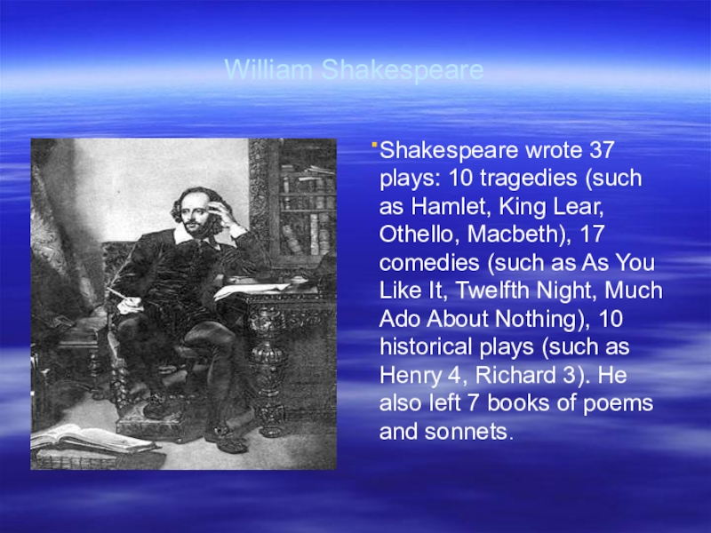 King Lear, Othello, Macbeth), 17 comedies (such as As You Like It, Twelfth Night, Much Ado About Nothing), 10 historical plays (such as Henry 4, Richard 3). He also left 7 books of poems and sonnets.