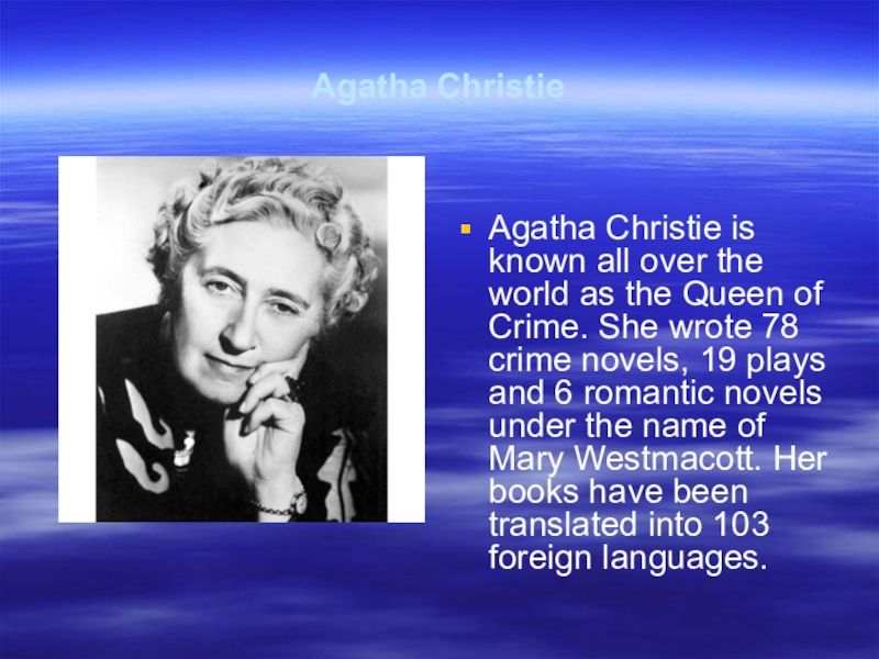 Queen of Crime. She wrote 78 crime novels, 19 plays and 6 romantic novels under the name of Mary Westmacott. Her books have been translated into 103 foreign languages.