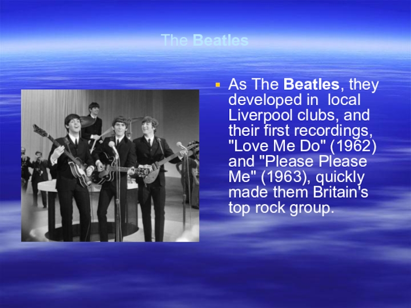their first recordings, "Love Me Do" (1962) and "Please Please Me" (1963), quickly made them Britain's top rock group.