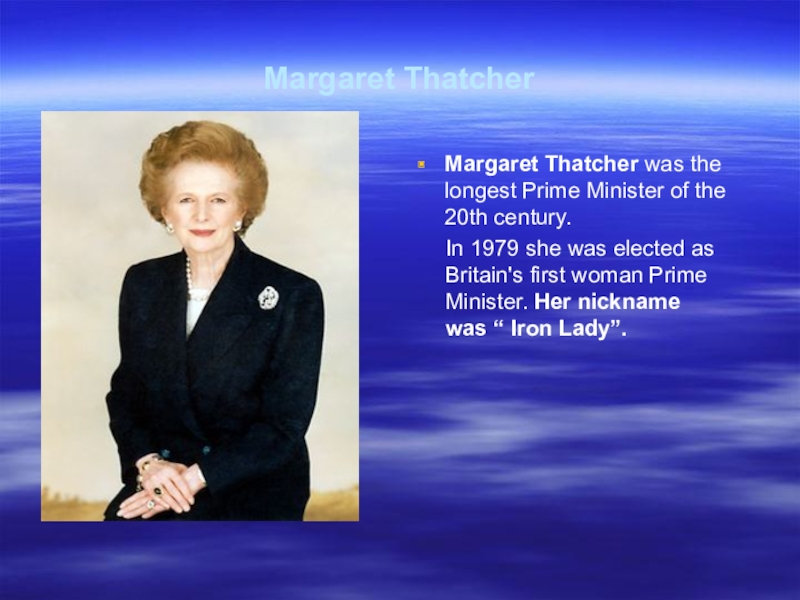 In 1979 she was elected as Britain's first woman Prime Minister. Her nickname was “ Iron Lady”.