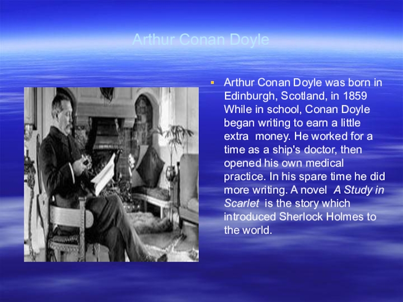 1859 While in school, Conan Doyle began writing to earn a little extra money. He worked for a time as a ship's doctor, then opened his own medical practice. In his spare time he did more writing. A novel A Study in Scarlet is the story which introduced Sherlock Holmes to the world.