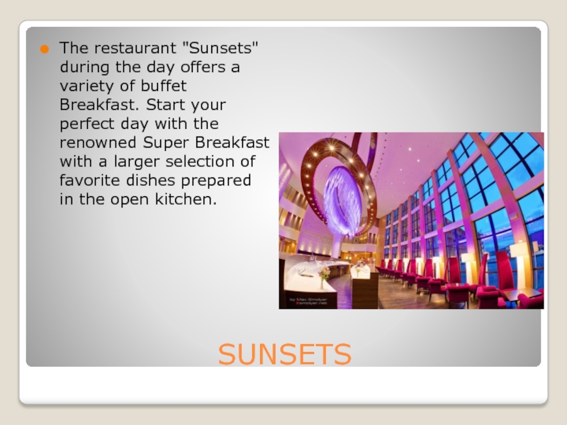 place that can lure You a wide selection of cocktails and aroma of dishes cooked under the watchful gaze of the chef. In the all-day restaurant Sunsets will delight You with appetizing American buffet and international cuisine.