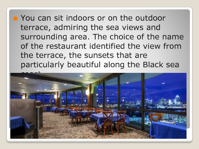 Слайд 13You can sit indoors or on the outdoor terrace, admiring the