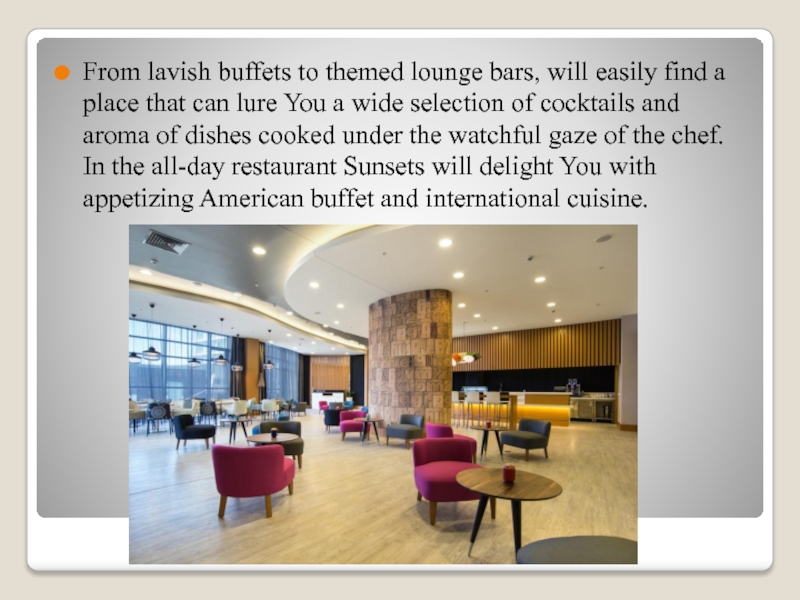 Слайд 10From lavish buffets to themed lounge bars, will easily find a