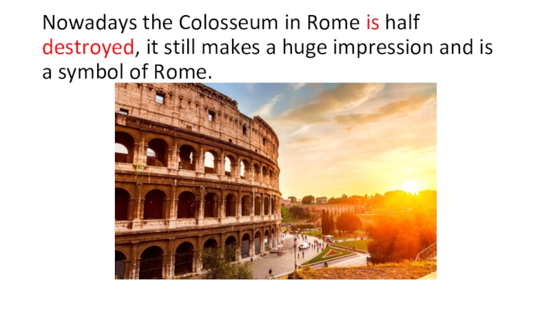 Слайд 5Nowadays the Colosseum in Rome is half destroyed, it still makes