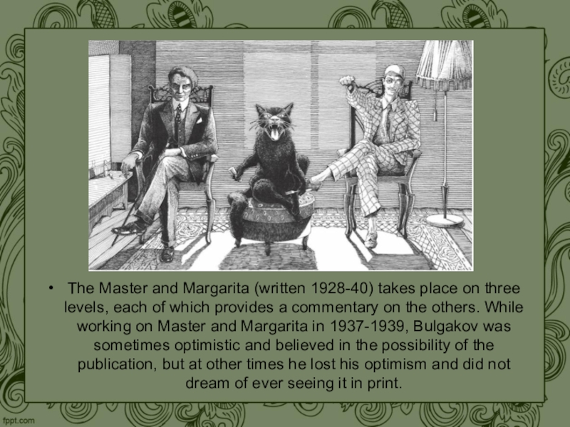 each of which provides a commentary on the others. While working on Master and Margarita in 1937-1939, Bulgakov was sometimes optimistic and believed in the possibility of the publication, but at other times he lost his optimism and did not dream of ever seeing it in print.