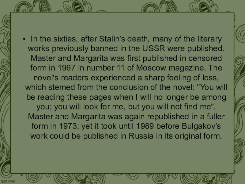 previously banned in the USSR were published. Master and Margarita was first published in censored form in 1967 in number 11 of Moscow magazine. The novel's readers experienced a sharp feeling of loss, which stemed from the conclusion of the novel: "You will be reading these pages when I will no longer be among you; you will look for me, but you will not find me". Master and Margarita was again republished in a fuller form in 1973; yet it took until 1989 before Bulgakov's work could be published in Russia in its original form.
