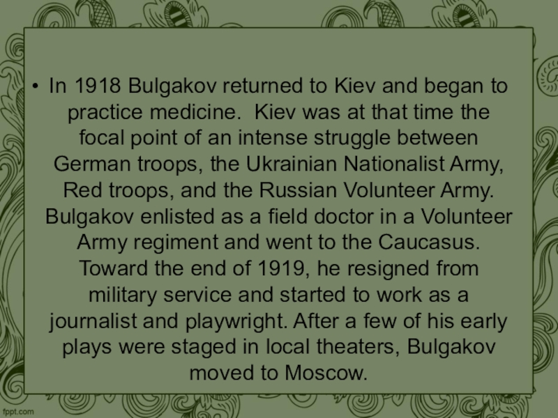 Слайд 4In 1918 Bulgakov returned to Kiev and began to practice medicine.