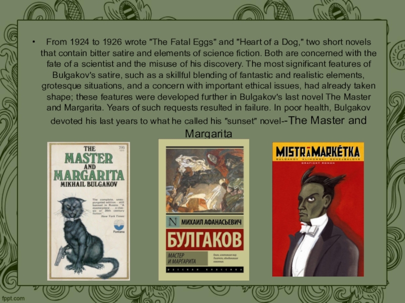 a Dog," two short novels that contain bitter satire and elements of science fiction. Both are concerned with the fate of a scientist and the misuse of his discovery. The most significant features of Bulgakov's satire, such as a skillful blending of fantastic and realistic elements, grotesque situations, and a concern with important ethical issues, had already taken shape; these features were developed further in Bulgakov's last novel The Master and Margarita. Years of such requests resulted in failure. In poor health, Bulgakov devoted his last years to what he called his "sunset" novel--The Master and Margarita