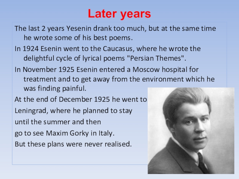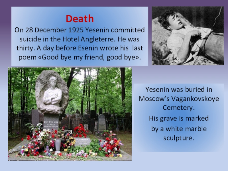 Yesenin was buried in Moscow’s Vagankovskoye Cemetery.
