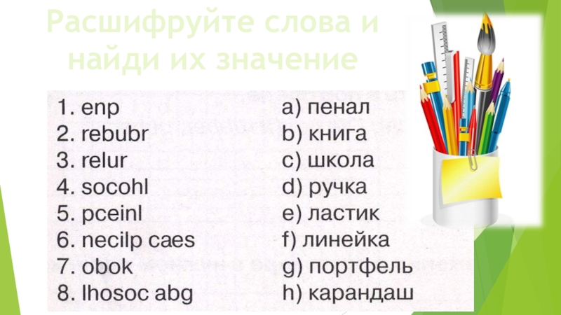 Разгадайте кроссвордРучкаЛинейкаШколаКарандашПортфельКнига