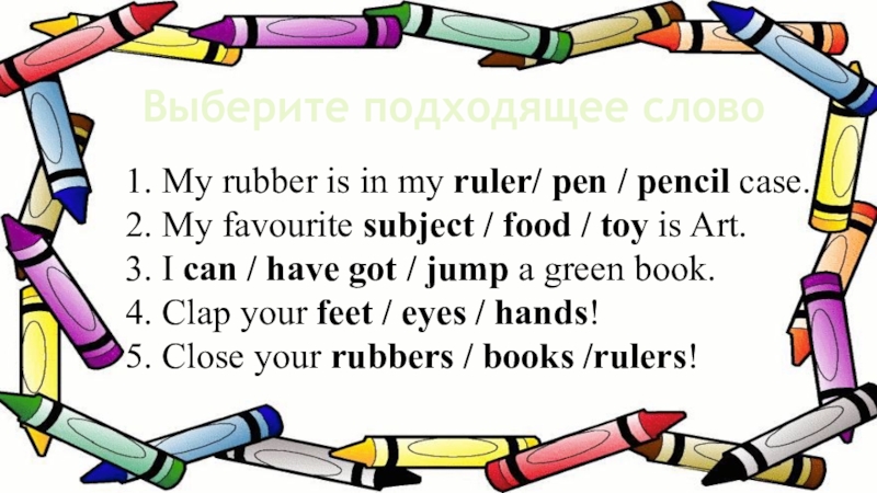 Выберите подходящее слово1. My rubber is in my ruler/ pen / pencil case.2. My favourite subject /