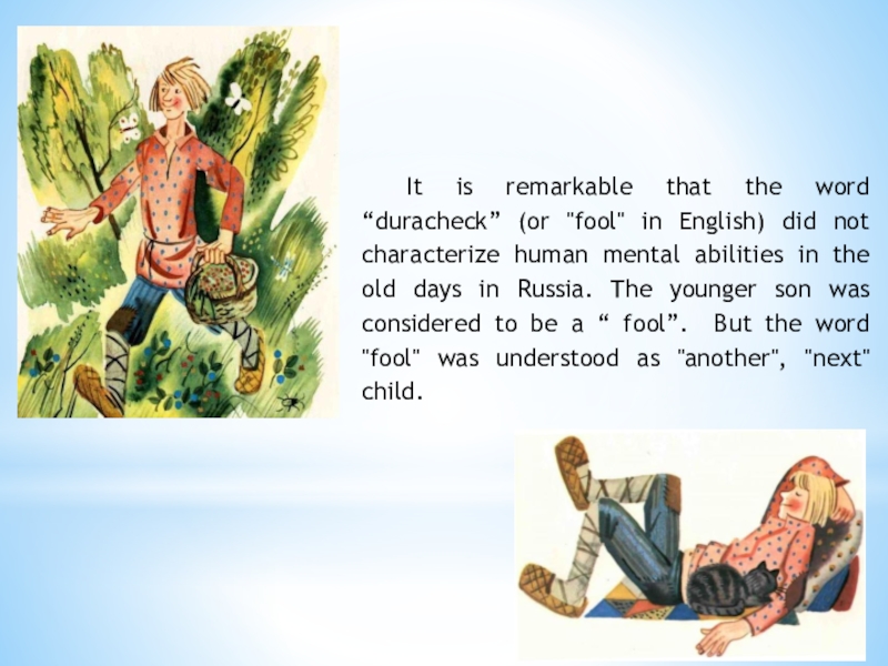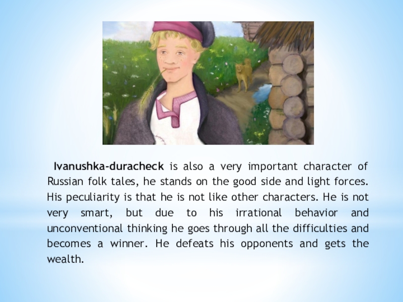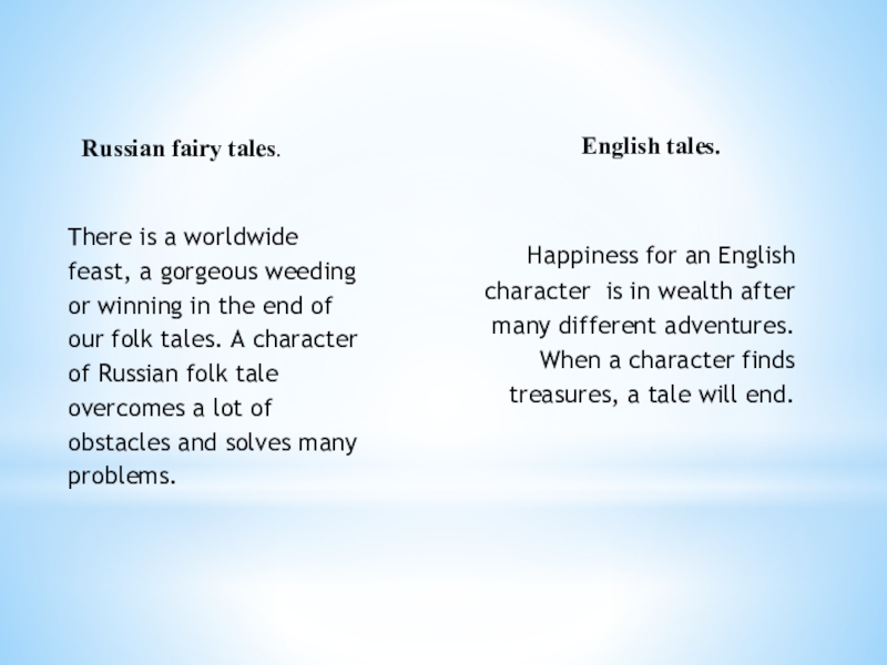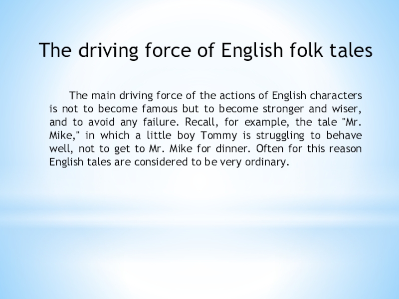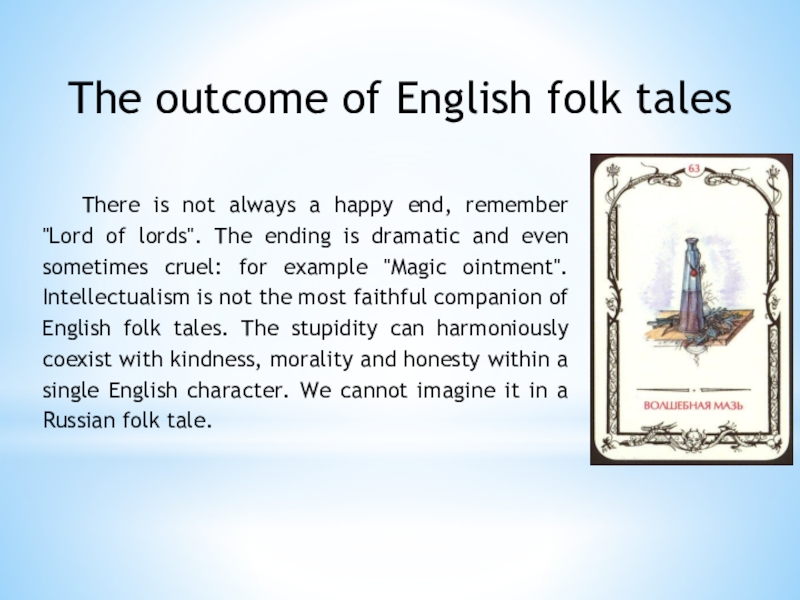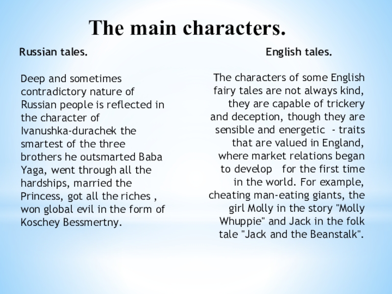 The characters of some English fairy tales are not always kind, they are capable of trickery and deception, though they are sensible and energetic - traits that are valued in England, where market relations began to develop for the first time in the world. For example, cheating man-eating giants, the girl Molly in the story "Molly Whuppie" and Jack in the folk tale "Jack and the Beanstalk".
