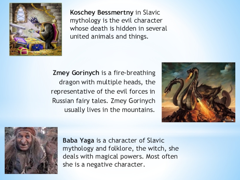 Zmey Gorinych is a fire-breathing dragon with multiple heads, the representative of the evil forces in Russian fairy tales. Zmey Gorinych usually lives in the mountains.
