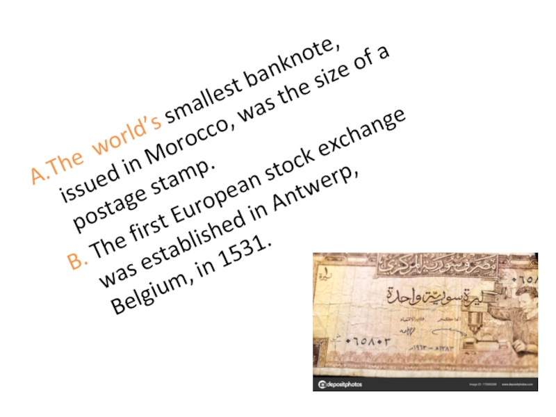 Слайд 2A.The world’s smallest banknote, issued in Morocco, was the size of