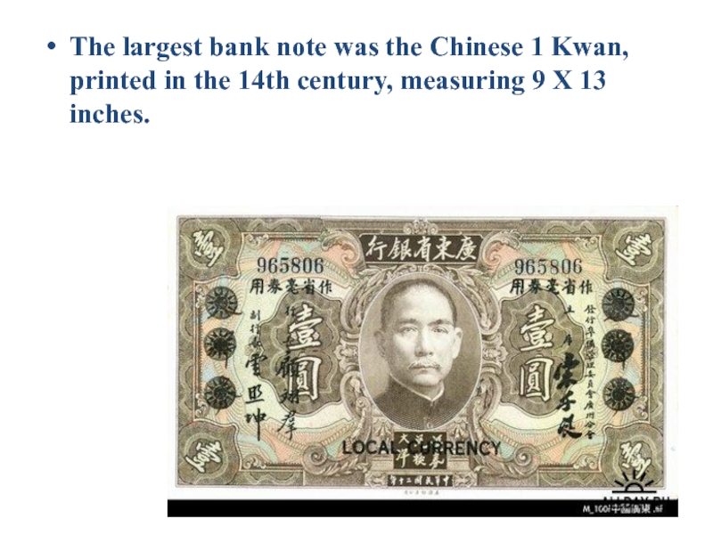 Слайд 16The largest bank note was the Chinese 1 Kwan, printed in