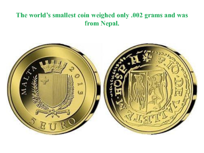Слайд 12The world’s smallest coin weighed only .002 grams and was from