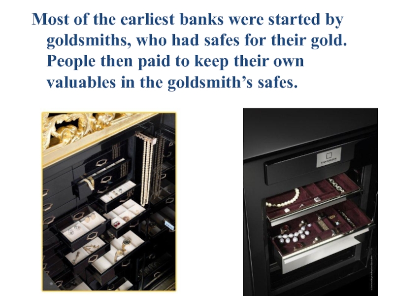 Слайд 19Most of the earliest banks were started by goldsmiths, who had