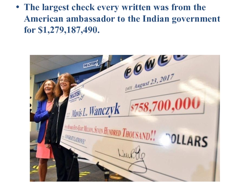 The largest check every written was from the American ambassador to the Indian government for $1,279,187,490.