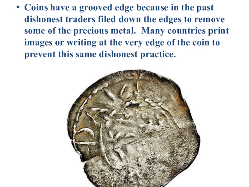 Слайд 18Coins have a grooved edge because in the past dishonest traders