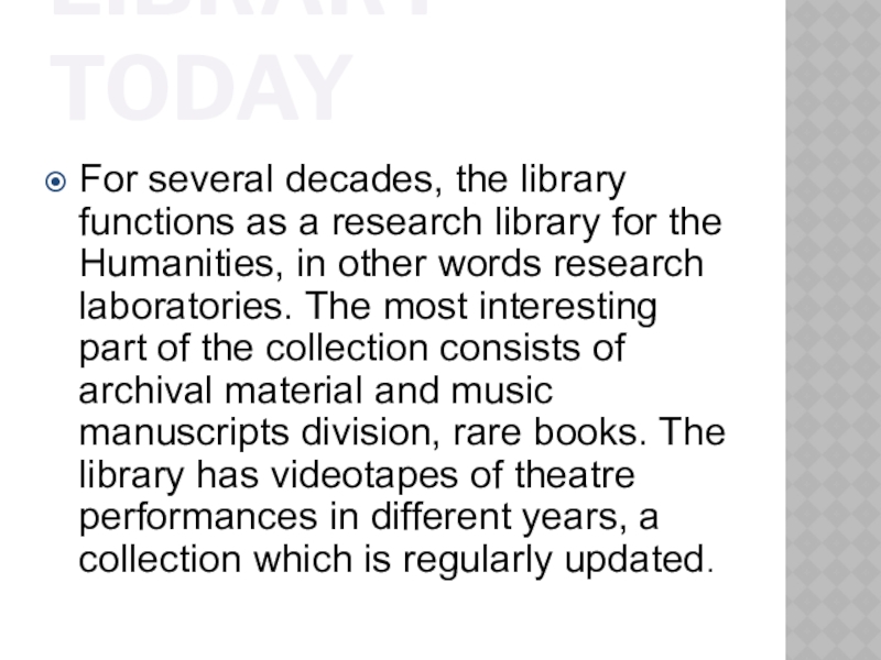 for the Humanities, in other words research laboratories. The most interesting part of the collection consists of archival material and music manuscripts division, rare books. The library has videotapes of theatre performances in different years, a collection which is regularly updated.