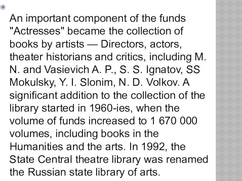 books by artists — Directors, actors, theater historians and critics, including M. N. and Vasievich A. P., S. S. Ignatov, SS Mokulsky, Y. I. Slonim, N. D. Volkov. A significant addition to the collection of the library started in 1960-ies, when the volume of funds increased to 1 670 000 volumes, including books in the Humanities and the arts. In 1992, the State Central theatre library was renamed the Russian state library of arts.