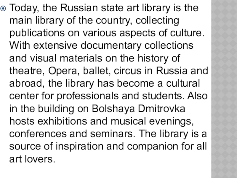 the country, collecting publications on various aspects of culture. With extensive documentary collections and visual materials on the history of theatre, Opera, ballet, circus in Russia and abroad, the library has become a cultural center for professionals and students. Also in the building on Bolshaya Dmitrovka hosts exhibitions and musical evenings, conferences and seminars. The library is a source of inspiration and companion for all art lovers.