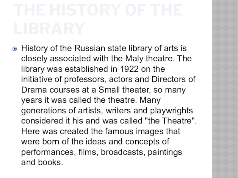 arts is closely associated with the Maly theatre. The library was established in 1922 on the initiative of professors, actors and Directors of Drama courses at a Small theater, so many years it was called the theatre. Many generations of artists, writers and playwrights considered it his and was called "the Theatre". Here was created the famous images that were born of the ideas and concepts of performances, films, broadcasts, paintings and books.